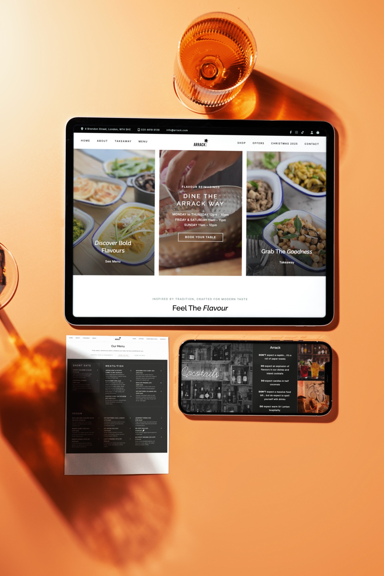 Website Development – Built a fully responsive, multi-functional website integrating the restaurant menu, takeaway ordering, cocktail menu, table reservations via SevenRooms, and a compliant e-commerce shop for Ceylon Arrack spirits.
